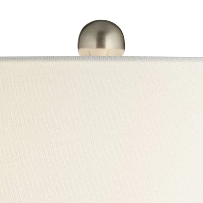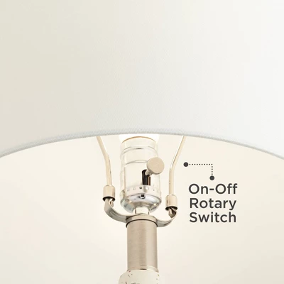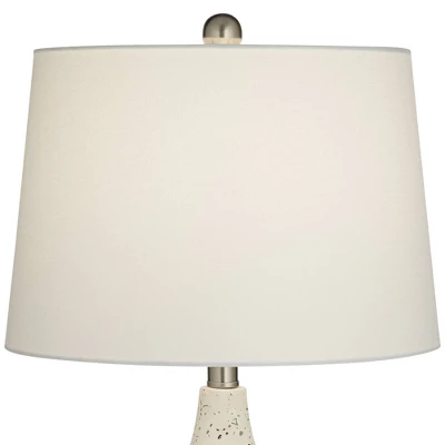 From the 360 Lighting brand, this elegant and modern table lamp design is sure to brighten your decor. It features a real ivory terrazzo marble base with a Mid-Century profile. The marble lamp base has random flecks of color in it for an added visual touch. Up top is a tapered drum shade in a white fabric material. Note that because the base uses real marble, there will be slight variations in color and pattern.