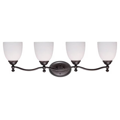 Brighten your bath space with the classic look of the bath bar light. The design features four lights set on a vertical frame. The frame, arms, and wallplate are all in a Roman Bronze finish. White glass lights provide even illumination for your room space.