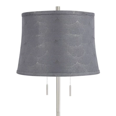 Update your living space with the help of this brushed steel finish floor lamp base. The design is crafted from metal, and has a chic contemporary look that’s ready to be paired with a stylish shade of your choosing. It comes with twin pull chains that rev up the style factor and make it easy to control the light output. Includes a Tieling gray fabric curved pinched drum shade with gingko leaf pattern.