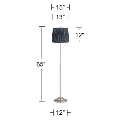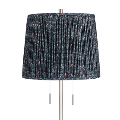 Update your living space with the help of this brushed steel finish floor lamp base. The design is crafted from metal, and has a chic contemporary look that’s ready to be paired with a stylish shade of your choosing. It comes with twin pull chains that rev up the style factor and make it easy to control the light output. Includes multi-color green floral patterned fabric shade. The decorative pattern is set against a blue color background, and the shade has a white polystyrene liner. Comes with the correct sized harp.