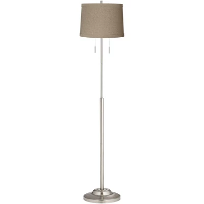 Update your living space with the help of this brushed nickel finish floor lamp. The design is crafted from metal, and has a chic contemporary look thatโs paired with a beautiful natural linen drum shade with self trim. It comes with twin pull chains that rev up the style factor and make it easy to control the light output.