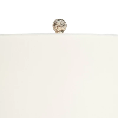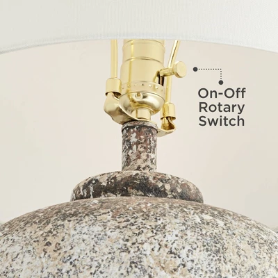 - Lamp base has a weathered vintage finish. White color base with earth tone accents. Cast resin construction.