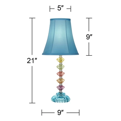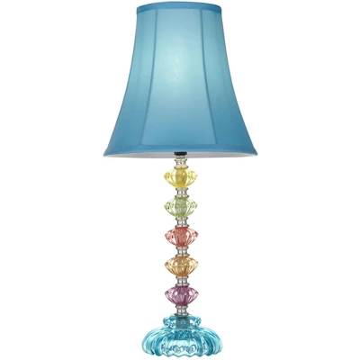Fun speaks volumes in the design of this set of two glass table lamps, a twist on traditional stacked glass lamp designs. Each lamp’s design features jewel-like pieces of glass in shades of pink, orange, purple, green, and yellow, stacked vertically and separated by silver finish accents. Each lamp sits over a teal blue glass base that perfectly complements a matching bell shade.