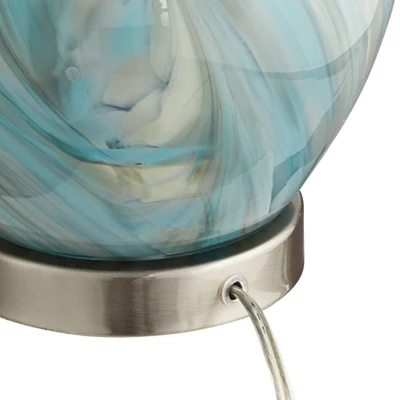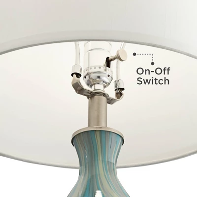 From the 360 Lighting brand, this sophisticated art glass table lamp is a beautiful addition to a contemporary or transitional living space. This lamp boasts a handcrafted art glass body with a vase silhouette. Swirls of blue and gray create a compelling mix of hues that brings artistry to your decor. On top is a tapering drum shade that creates a clean, precise presentation.