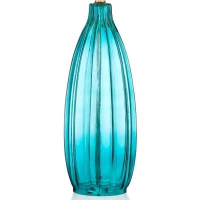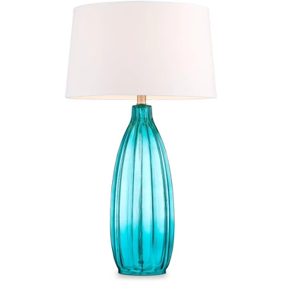 This set of two ultra-chic glass table lamps features a classic design in a sleek fluted motif. A bright pop of blue in the shade complements the modern look. A white drum lamp shade completes the look.