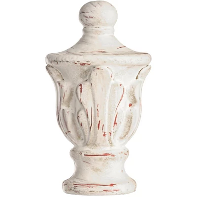 - Distressed antique white finish with burgundy undertones. Cast resin and metal construction.