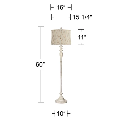 Use this classic traditional style floor lamp base to create your own custom floor lamp design. Just add a shade up top in the color and pattern of your choice to create a look that’s unique to your decor. The base features fluted elements and a round pedestal at the bottom. Crafted from cast resin and metal, the base comes in a distressed, vintage-look rubbed white finish with burgundy undertones. Includes a cream pinched drum shade with leaf botanical pattern.