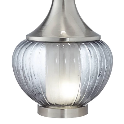 Decorate the easy way with this set of 2 modern lamps from the 360 Lighting brand. Each lamp base features fluted smoked glass around smooth milk glass for a multi-layered design look. Spun metal in a brushed nickel finish draws the eye upward to white linen drum shades. A night light in the bases enhances the glamorous glow of these modern lamps.