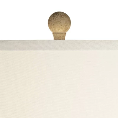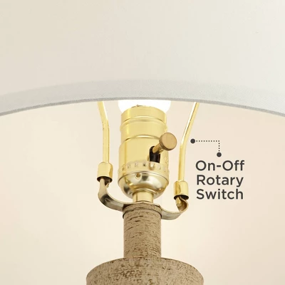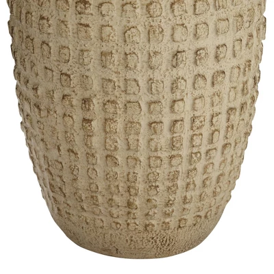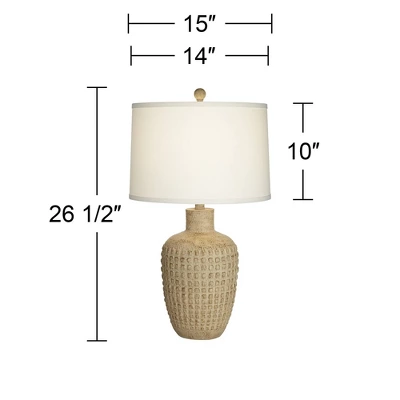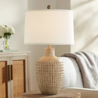 Add a bit of organic cool to your decor with this jar profile table lamp design. From the 360 Lighting brand, the lamp features a textured base with a decorative pattern crafted from cast resin material. The faux terra cotta finish on the base blends with the off-white tapered lamp shade up top.