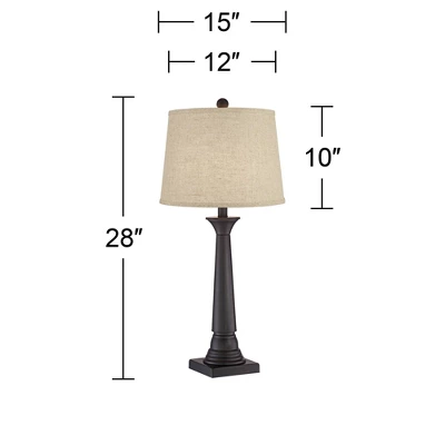 Clean and streamlined, this modern table lamp set features a classic tapered column profile. Each table lamp features a deep bronze finish that matches the finial. Topped with burlap colored drum shades to complete the pair.