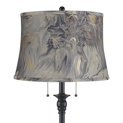 - Black finish. Gray swirl abstract pattern polyester tapered drum shade with white interior lining.