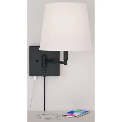 This beautiful Lanett plug-in wall lamps set of two features white down shades. Combining a black finish with metal construction, these wall lamps from the 360 Lighting brand also have integrated USB ports for convenient charging. A dimmer switch on the backplate controls the light intensity.
