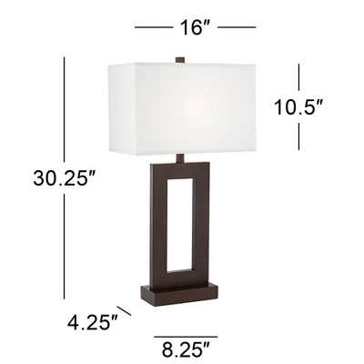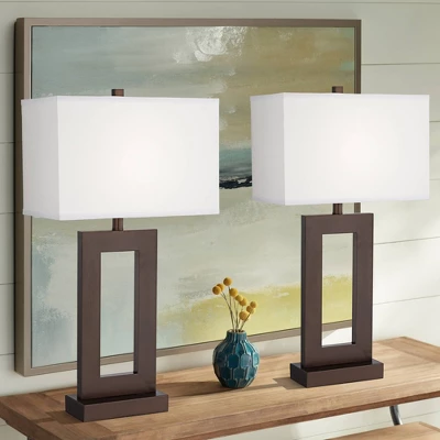 A simple and modern design featuring an open rectangular base adds a sleek look to this set of two open window table lamps. With a contemporary bronze finish complementing crisp white box shades, it presents a versatile palette with compelling contrast. A petite finial at each top adds subtle style. By 360 Lighting.