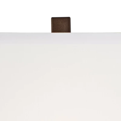 - Bronze finish open window bases. Metal construction. White rectangular shades.