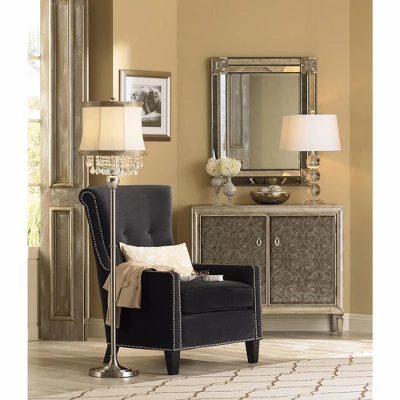 - Three crystal balls and a rectangular crystal pedestal. Silver finish metal pole and other accents.