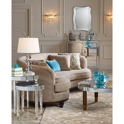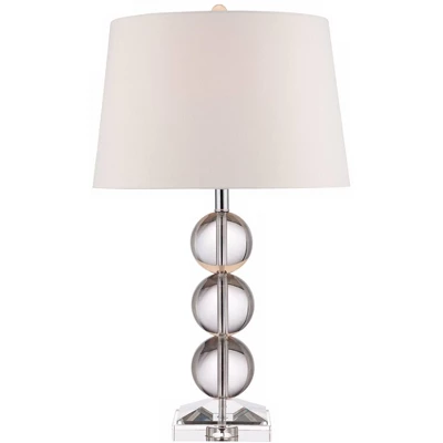 Three stacked, clear crystal globes form the base of this exciting modern table lamp. A faceted square base adds charm and additional sparkle while a white drum shade completes this enchanting look.