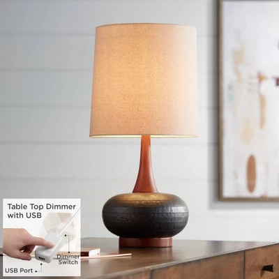Combining wood and ceramic material, this lovely modern table lamp is topped with a tall drum shade. The warm tones in the wood base, neck and finial are offset by the subtle hammered effect on the handcrafted base ceramic. A beautiful lighting solution versatile enough for any room in your home. Tabletop dimmer included.