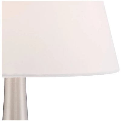 The classic and minimalist inspired design features a brushed nickel finish topped by a crisp white lamp shade. Just touch anywhere on the pedestal base to turn the lamp on or off.