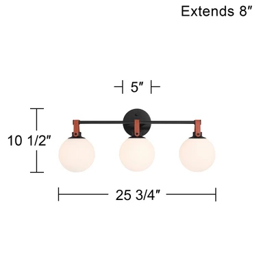 - 25 3/4″ wide x 10 1/2″ high. Extends 8″ from the wall. Round backplate is 5″ diameter. Center of mounting point to top of fixture is 2 1/2″. Weighs 3.76 lbs.