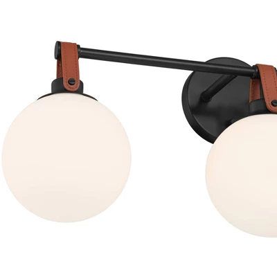 - Black finish over metal construction. White glass globe shades. Brown leather straps.