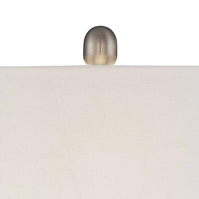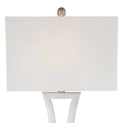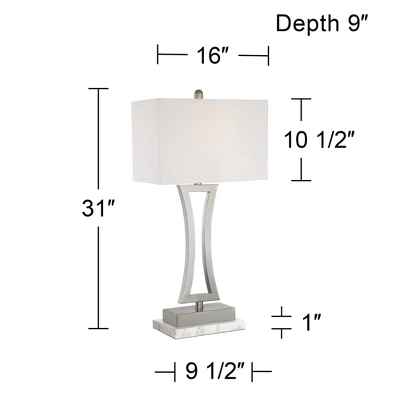 Create a cohesive look in your bedroom or living room with this modern table lamp set. From the 360 Lighting brand, each lamp comes in a sleek brushed nickel finish for a contemporary shine. The metal frame offers an eye-catching geometric look with a curved, opened-up column sitting atop a flat rectangular base. An off-white rectangular lamp shade delivers an angular flair with a charmingly rounded finial on top. Set comes with two white marble riser stands to give the lamps extra height.