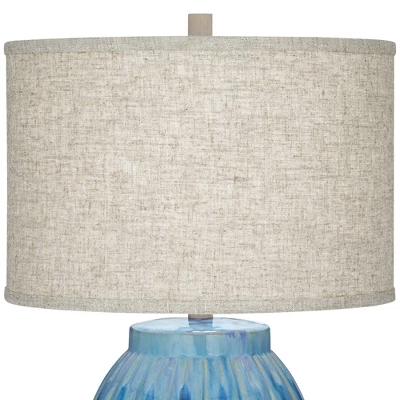Warm and comfortable lighting sets the mood in any room, and this modern table lamp is a wonderful way to add that to your own decor. The design features a ceramic base in a blue glaze finish with hints of green. The base is decorated with a pattern of vertical grooved lines that help emphasize the height of the lamp. Up top is an oatmeal color fabric drum shade.