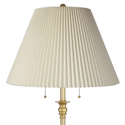 The traditional style of this designer floor lamp is sure to add a simple elegance to your living space. From the 360 Lighting brand, the lamp comes with a warm brass finish and an beige fabric pleated lamp shade. It has a timeless design sure to gracefully blend in to your classic-looking home. The twin pull chains make it easy to turn each light on and off.