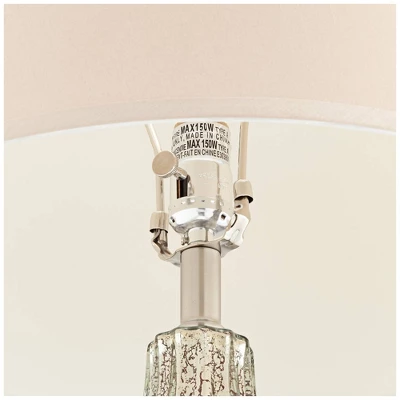 - Fluted mercury glass body. Taupe fabric tapered drum shade. 8-foot long cord.